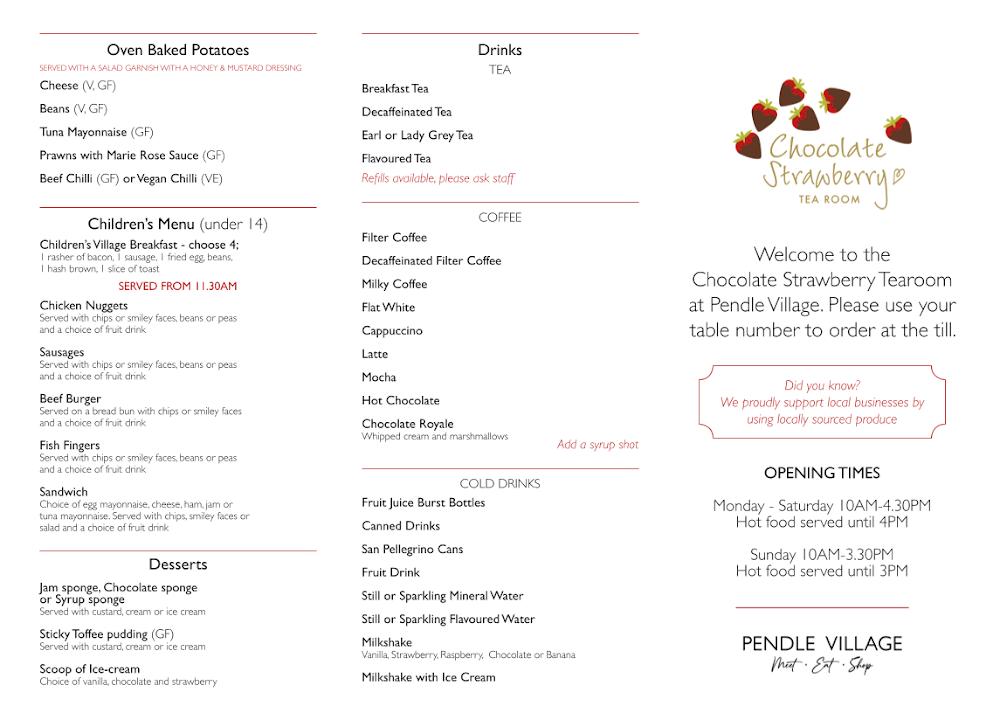 Located at Pendle Village Mill in Brierfield, The Chocolate Strawberry Cafe Tearoom is set within a home, furniture, and lifestyle shopping destination, making it a perfect stop for a break while exploring the local shops. The cafe welcomes visitors with its bright and airy environment, featuring both indoor and outdoor seating options—all wheelchair accessible. The garden centre setting offers beautiful scenery, enhancing the dining experience whether you choose to sit inside or enjoy the fresh air outside.